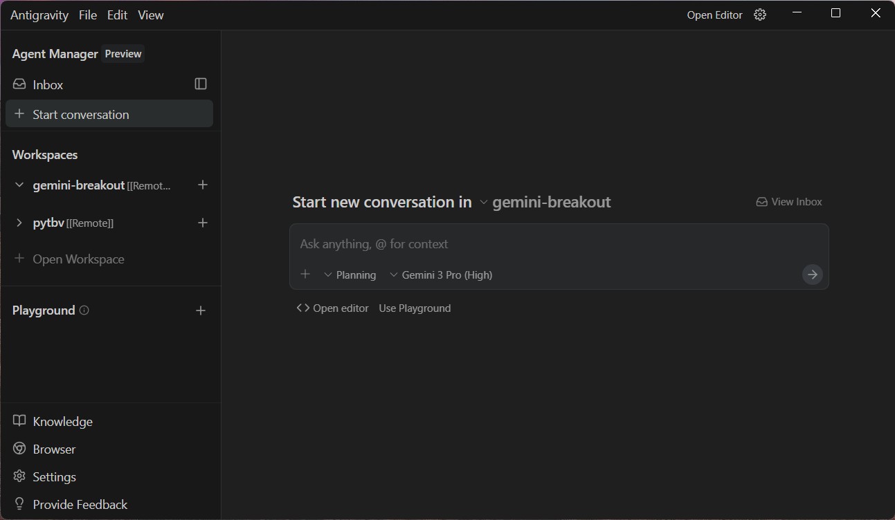 When you open Antigravity, it doesn’t ask you to create or open a file. Instead, it asks how you want to interact with the LLM. And once you launch the Agent Manager, the interface feels very familiar, almost like using ChatGPT or Claude, except you’re chatting with an LLM inside a workspace designed for development.